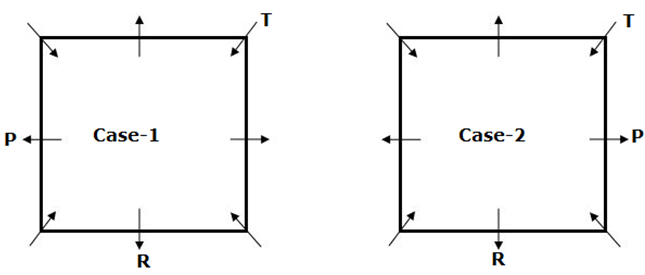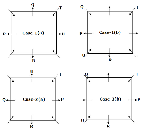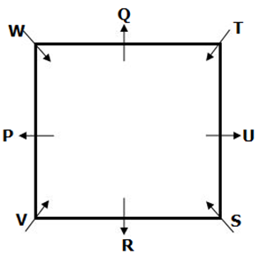 आठ व्यक्ति P, Q, R, S, T, U, V और W एक वर्गाकार मेज़ पर बैठे हैं इस तरह से कि उनमें से चार कोनों पर बैठे हैं और शेष प्रत्येक भुजाओं के बीच में बैठे हैं। जो लोग कोनों पर बैठे हैं उनका मुख मेज के केंद्र की ओर हैं और जो लोग भुजाओं के बीच में बैठे हैं उनका मुख मेज के केंद्र से बाहर की ओर हैं।