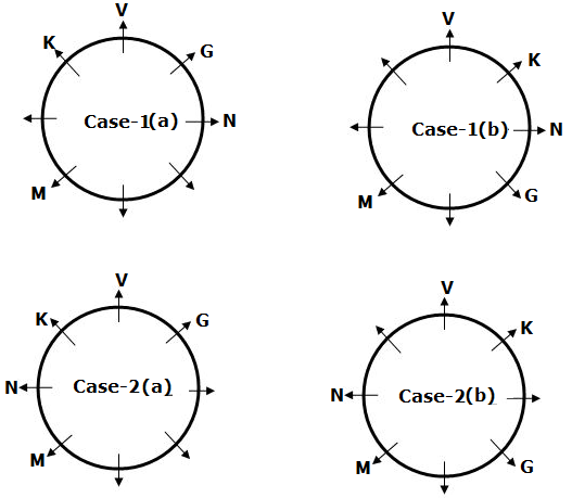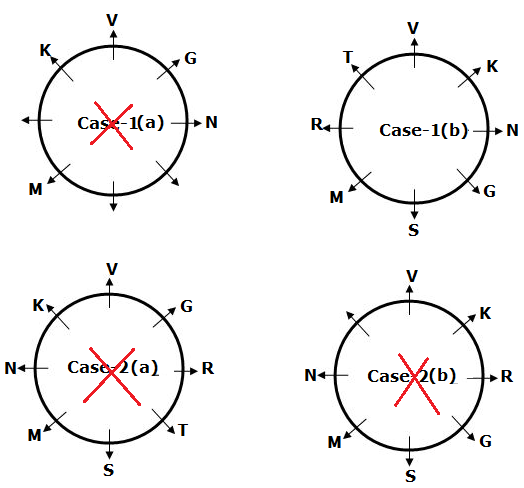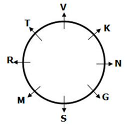 आठ व्यक्ति एक वर्ताकार मेज में बैठे हैं और वे सभी टेबल के केंद्र के बाहर का सामना करते हैं । V M के दाईं ओर तीसरे स्थान पर बैठता है। केवल एक व्यक्ति V और N के बीच बैठता है (या तो V से दाएं या बाएं )। K G के बाईं ओर दूसरा स्थान पर बैठता है, जो M का तत्काल पड़ोसी नहीं है। N और S के बीच बैठे लोगो की संख्या R और S के बीच बैठे व्यक्तियों की संख्या के समान है। T R के तत्काल दायाँ पर बैठता है। T K के विपरीत नहीं बैठता है।