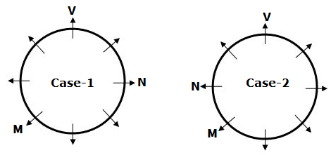 V M के दाईं ओर तीसरे स्थान पर बैठता है। केवल एक व्यक्ति V और N के बीच बैठता है (या तो V से दाएं या बाएं से)।