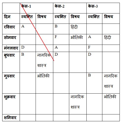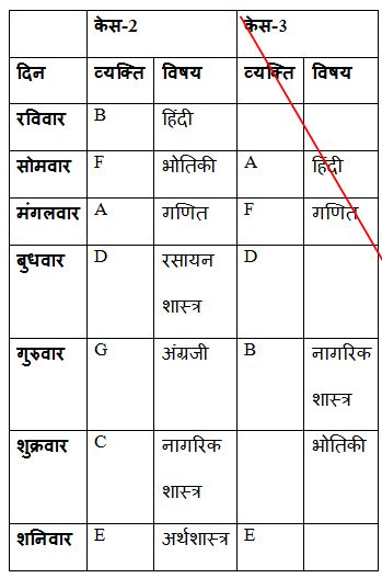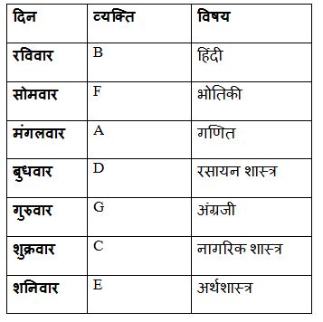 सात छात्र A, B, C, D, E, F और G, सात विभिन्न विषयों अर्थात् अंग्रेजी, गणित, भौतिकी, रसायन शास्त्र, हिंदी, अर्थशास्त्र और नागरिक शास्त्र पर सेमिनार लेने जा रहे हैं, लेकिन एक ही क्रम में आवश्यक नहीं हैं। वे सभी रविवार से शुरू होने वाले उसी सप्ताह के लगातार दिनों में सेमिनार आयोजित कर रहे हैं।