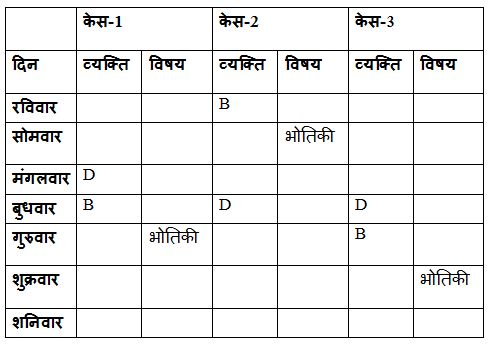 - केवल एक व्यक्ति ने D और उस व्यक्ति के बीच सेमिनार लिया जो भौतिकी पर सेमिनार आयोजित करता है, जो B के तत्काल बाद सेमिनार आयोजित करता है| D सोमवार के बाद और गुरुवार से पहले किसी दिन सेमिनार आयोजित करता है।