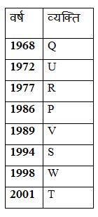 आठ व्यक्ति P, Q, R, S, T, U, V और W विभिन्न वर्षों में पैदा हुए हैं, जैसे 1968, 1972, 1977, 1986, 1989, 1994, 1998 और 2001, लेकिन उसी क्रम में आवश्यक नहीं थे। उनकी आयु की गणना वर्ष 2018 के आधार पर की गई थी।