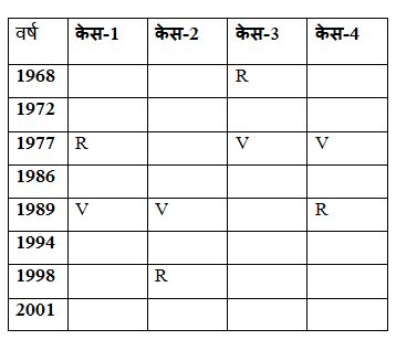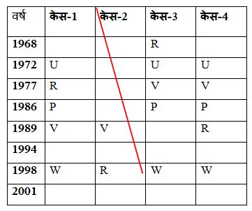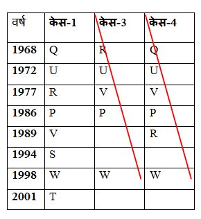 R और V के बीच केवल एक व्यक्ति पैदा होता है, जिसकी आयु सम संख्या नहीं है। V सबसे कम आयु का व्यक्ति नहीं है। दो व्यक्ति P और W के बीच पैदा हुए हैं, जो P से छोटे हैं। W के बाद पैदा हुए व्यक्ति की संख्या, U के पहले पैदा हुए व्यक्ति की संख्या के समान हैं। U 1986 में पैदा नहीं हुआ। Q P से बड़ा है। R और W के बीच पैदा हुआ व्यक्तिओ की संख्या U और S के बीच पैदा हुए व्यक्तियों की संख्या के समान है।
