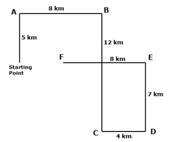 अरुण बिंदु A तक पहुंचने के लिए उत्तर की ओर 5 किमी चलने लगता हैं। वहां से वह दायाँ मोड़ लिया और 8 किमी बिंदु B तक पहुंचने के लिए चलता है। इसके बाद वह एक दायाँ मोड़ लिया और 12 किमी बिंदु C तक पहुंचने के लिए चलता है, जो कि बिंदु D के पश्चिम में 4 किमी पर है। बिंदु D से, अरुण उत्तर की ओर 7 किमी बिंदु E तक पहुंचने के लिए चलता है। अंत में वह बाएं मोड़ लिया और 8 किमी बिंदु F तक पहुंचने के लिए चलता है।