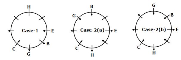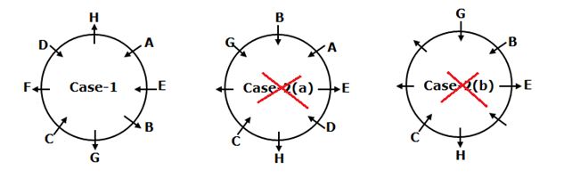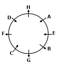 आठ व्यक्ति A, B, C, D, E, F, G और H एक गोलाकार मेज में बैठे हैं और उनमें से चार टेबल के केंद्र का सामना कर रहे हैं और शेष टेबल के केंद्र के विपरीत का सामना कर रहे हैं| लेकिन आवश्यक नहीं है कि इसी क्रम में हो। एक साथ बैठे दो से अधिक व्यक्ति एक ही दिशा का सामना नहीं कर रहे हैं।