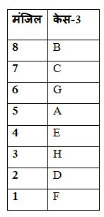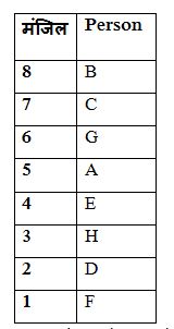 आठ व्यक्ति A, B, C, D, E, F, G और H आठ मंजिल वाली इमारत पर इस तरह से रह रहे हैं कि सबसे नीचे की मंजिल को संख्या एक गिना जाता है, और उसके ऊपर की मंजिल को दो गिना जाता है और इसी तरह शीर्ष मंजिल को संख्या आठ  गिना जाता है