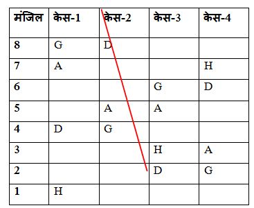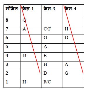 D और A के बीच केवल दो लोग रह रहे हैं, जो किसी एक विषम संख्या मंजिल पर रहते हैं, लेकिन सबसे नीचे की मंजिल पर नहीं। तीन लोग D और G के बीच रह रहे हैं। G से ऊपर रहने वाले लोगो की संख्या H के नीचे रहने वाले व्यक्तियों की संख्या के समान हैं। C और E के बीच रहने वाले लोगों की संख्या,F और E के बीच रहने वाले लोगों की संख्या के समान हैं। D C के तत्काल ऊपर नहीं रहता है।