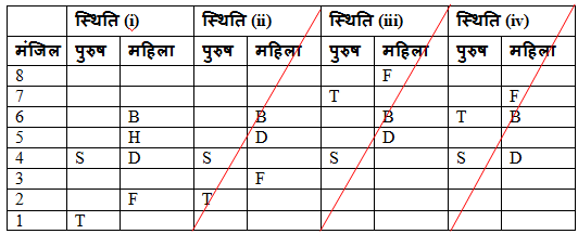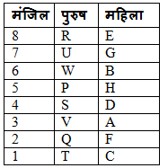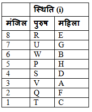 आठ जोड़े एक अपार्टमेंट में आठ अलग-अलग मंजिल में रह रहे हैं। P, Q, R, S, T, U, V और W पुरुष A, B, C, D, E, F, G और H महिला से विवाहित सदस्य हैं। निम्नतम मंजिल की संख्या एक है, उसके ऊपर की मंजिल की संख्या दो और शीर्ष मंजिल आठ तक गिने जाते है। सभी दी गई जानकारी एक ही क्रम में होने की आवश्यकता नहीं है।