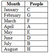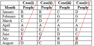 आठ लोग A, B, C, D, E, F, G और H एक वर्ष में आठ अलग-अलग महीनों में मुंबई जा रहे हैं। महीने जनवरी, फरवरी, मार्च, अप्रैल, मई, जून, जुलाई और अगस्त हैं। केवल एक व्यक्ति एक महीने में मुंबई जा रहा है। सभी जानकारी एक ही क्रम में होना जरूरी नहीं है.