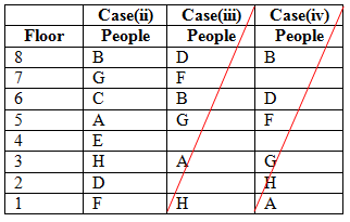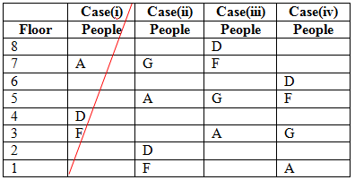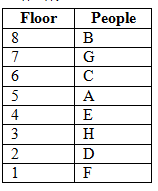 आठ लोग A, B, C, D, E, F, G और H आठ अलग-अलग मंजिल में रह रहे हैं।निम्नतम मंजिल की संख्या 1 है, और इससे ऊपर मंजिल 2 और सबसे ऊपर मंजिल संख्या 8 तक है। सभी दी गई जानकारी एक ही क्रम में आवश्यक नहीं है। B E के नीचे किसी भी मंजिल पर नहीं रह रहा है। A विषम क्रमांक मंजिल पर रहता है। केवल तीन लोग F और A के बीच रहते हैं|D F के तुरंत ऊपर रहता है| केवल एक व्यक्ति A और G के बीच रहता है| G A के नीचे किसी भी मंजिल पर नहीं रहता है । B और H के बीच तीन से अधिक लोग रहते हैं। केवल एक व्यक्ति C और E के बीच रहता है|C न तो मंजिल संख्या 4 में रहता है और न ही मंजिल संख्या 2 में रहता है.