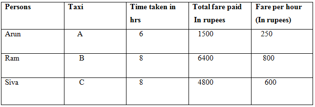 Three persons Arun, Siva and Ram travelled to three places via different taxies A, B and C not in same order. The fare is reckoned based on time taken to travel the distance and Arun opts taxi A and he paid Rs. 1500 for his entire ride and time taken by Arun to travel the distance is 6 hrs. Ram goes by taxi B and he has to pay 800 per hour as a fare. Time taken by taxi C to travel the distance is 8 hours. Ram paid Rs .6400 for his ride. Siva raided by taxi C and he paid 75% of total amount paid by Ram.