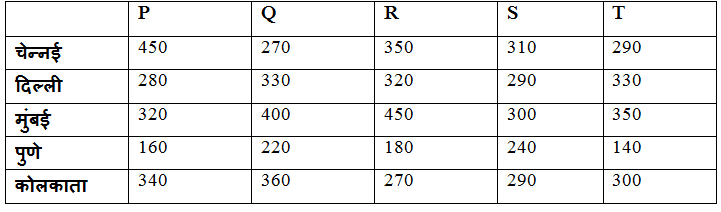 6) चेन्नई और पुणे से संस्थान Q में अध्ययन कर रहे छात्रों की कुल संख्या और मुंबई और कोलकाता से संस्थान S में अध्ययन कर रहे छात्रों की कुल संख्या के बीच अंतर ज्ञात कीजिए?
