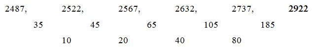 1) 2487, 2522, 2567, 2632, 2737, ?