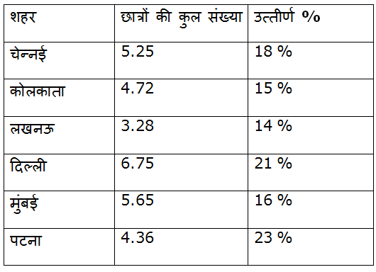 निम्नलिखित तालिका विभिन्न राज्यों से प्रवेश परीक्षा के लिए उपस्थित छात्रों की कुल संख्या (लाखों में) और उनमें से उत्तीर्ण छात्रों का प्रतिशत दिखाती है।