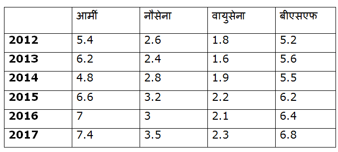 7) सभी दिए गए वर्षों में एक साथ आर्मी और वायुसेना में शामिल लोगों की कुल संख्या के बीच अंतर ज्ञात कीजिये?