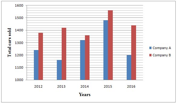 निम्नलिखित बार ग्राफ 5 अलग-अलग वर्षों में 2 अलग-अलग कंपनियों की कारों की बिक्री दिखाता है।