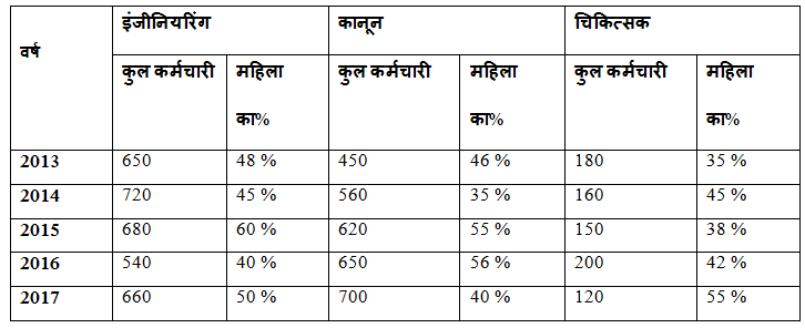 निम्नलिखित तालिका अलग-अलग विभागों से अलग-अलग वर्षों में पेशेवरों की कुल संख्या को एक निश्चित शहर में और उनमें से महिला का प्रतिशत दिखाती है।