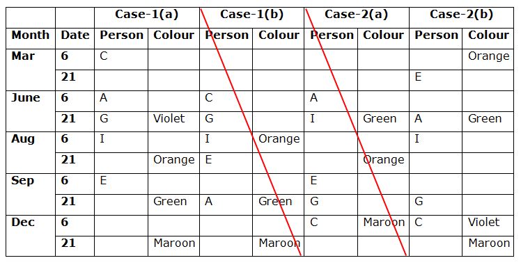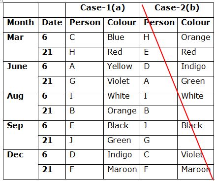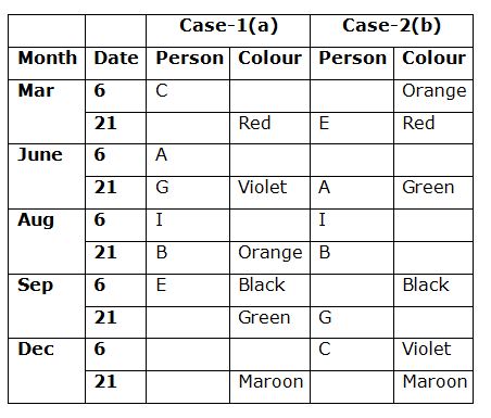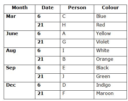 Ten persons A, B, C, D, E, F, G, H, I and J are attending the seminar in five different months of the same year viz., August, September, March, June and December. They all are attending the seminars in the dates of either in 6th or 21st of the each given months. They are likes ten different colours namely, Violet, Indigo, Blue, Green, Yellow, Orange, Red, Black, White and Maroon but not necessary in the same order.