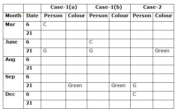 G attends the seminar in one of the months has 30 days but not in the even numbered date. Three persons attend the seminar between G and the one who likes Green. Atleast three persons attend the seminar between the one who likes Green and C, who attends one of the even numbered date.