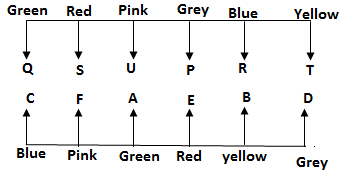 P, Q, R, S, T and U are facing south. In Row II: A, B, C, D, E and F are facing north. Each of them in a row likes six different colours namely Red, Blue, Green, Pink, Yellow and Grey.No two people who likes same colour faces each other.All the information is not necessary to be in the same order.