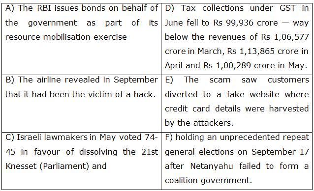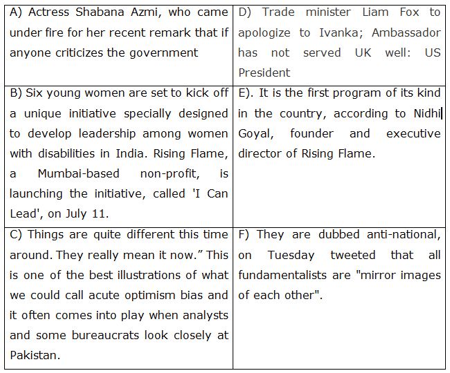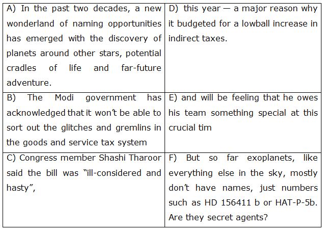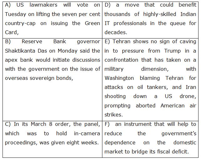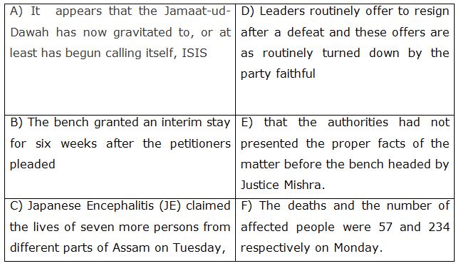 Direction (6-10): In the following questions two columns are given containing three Sentences/phrases each. In first column, sentences/phrases are A, B and C and in the second column the sentences/phrases are D, E and F. A sentence/phrase from the first column may or may not connect with another sentence/phrase from the second column to make a grammatically and contextually correct sentence. Each question has five options, four of which display the sequence(s) in which the sentences/phrases can be joined to form a grammatically and contextually correct sentence. If none of the options given forms a correct sentence after combination, mark (e), i.e. “None of these” as your answer.