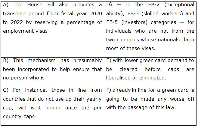 (A-D): The House Bill also provides a transition period from fiscal year 2020 to 2022 by reserving a percentage of employment visas — in the EB-2 (exceptional ability), EB-3 (skilled workers) and EB-5 (investors) categories — for individuals who are not from the two countries whose nationals claim most of these visas.