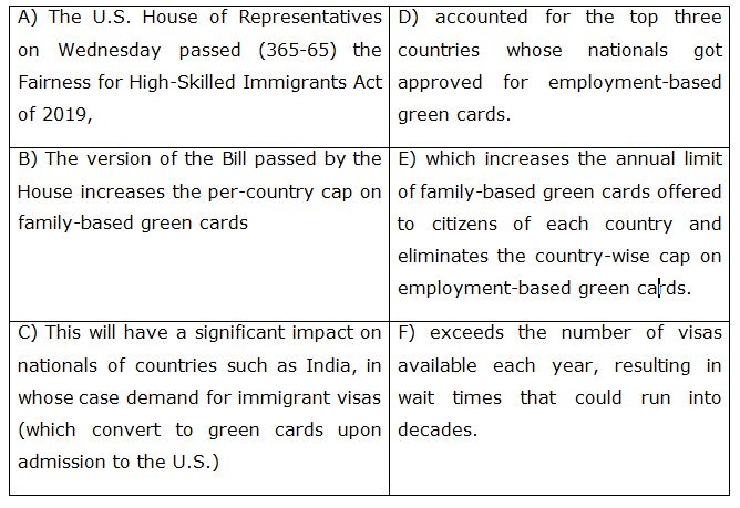 (A-E): The U.S. House of Representatives on Wednesday passed (365-65) the Fairness for High-Skilled Immigrants Act of 2019, which increases the annual limit of family-based green cards offered to citizens of each country and eliminates the country-wise cap on employment-based green cards.