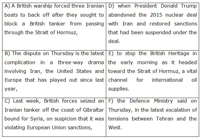 Direction (6-10): In the following questions two columns are given containing three Sentences/phrases each. In first column, sentences/phrases are A, B and C and in the second column the sentences/phrases are D, E and F. A sentence/phrase from the first column may or may not connect with another sentence/phrase from the second column to make a grammatically and contextually correct sentence. Each question has five options, four of which display the sequence(s) in which the sentences/phrases can be joined to form a grammatically and contextually correct sentence. If none of the options given forms a correct sentence after combination, mark (e), i.e. “None of these” as your answer.