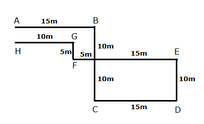 Anil walks 15m from point A towards the east to reach point B. Then he takes right turn and walks for 20m to reach point C. Now he takes a left turn and walks for 15m to reach point D. Then he takes a left turn and walks for 10m to reach point E. Then he takes a left turn and walks for 20m to reach point F. Now he takes a right turn and walks for 5m to reach point G. Then he takes a left turn and walks for 10m to reach point H.