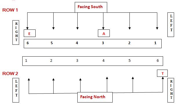 In Row 1 – A,B,C,D,E and F are seated and facing towards south and in