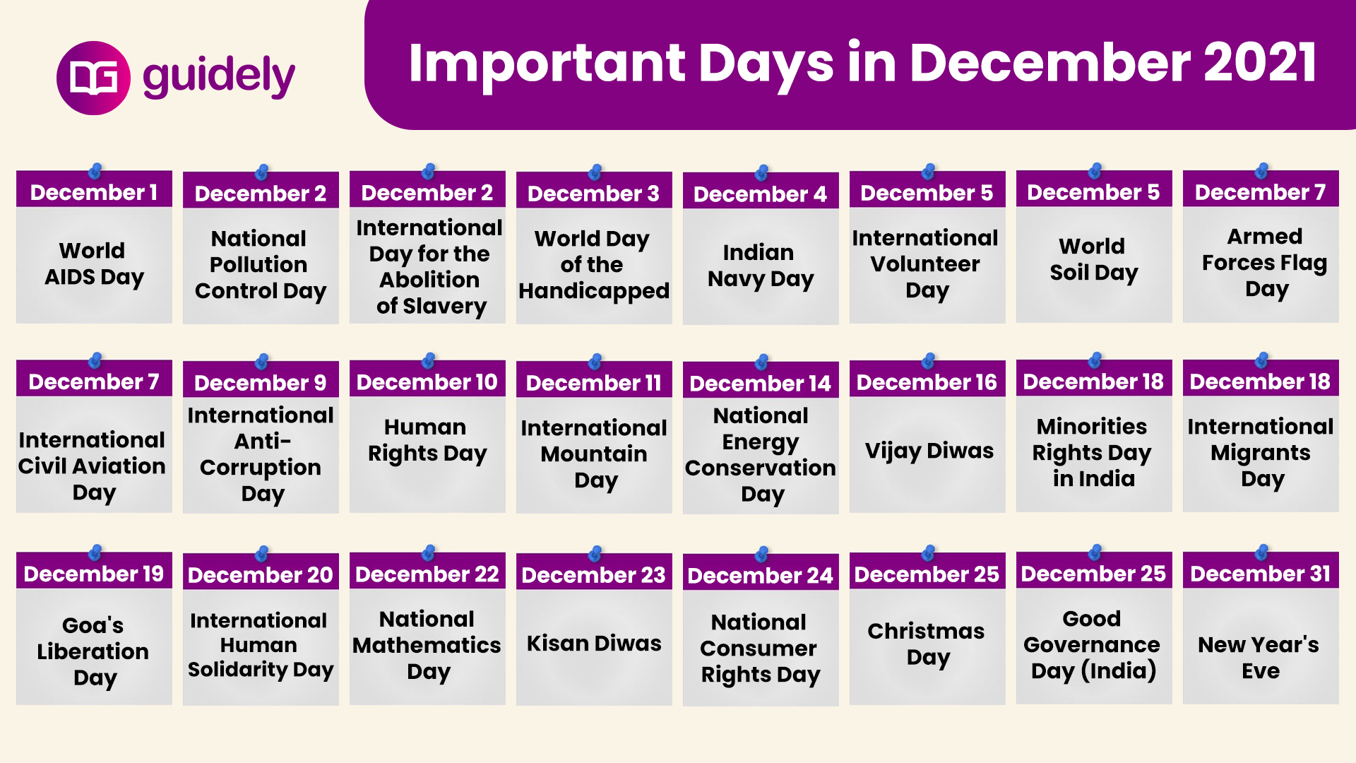 Important Days in December 2021 with themes pdf (Dec 19) – Goa Liberation Day is observed on 19th December every year. Indian armed forces freed Goa in 1961 following 450 years of Portuguese rule. Goa Liberation Day is marked by an abundance of events and festivities in Goa though this time because of the pandemic the celebrations are expected to be muted.