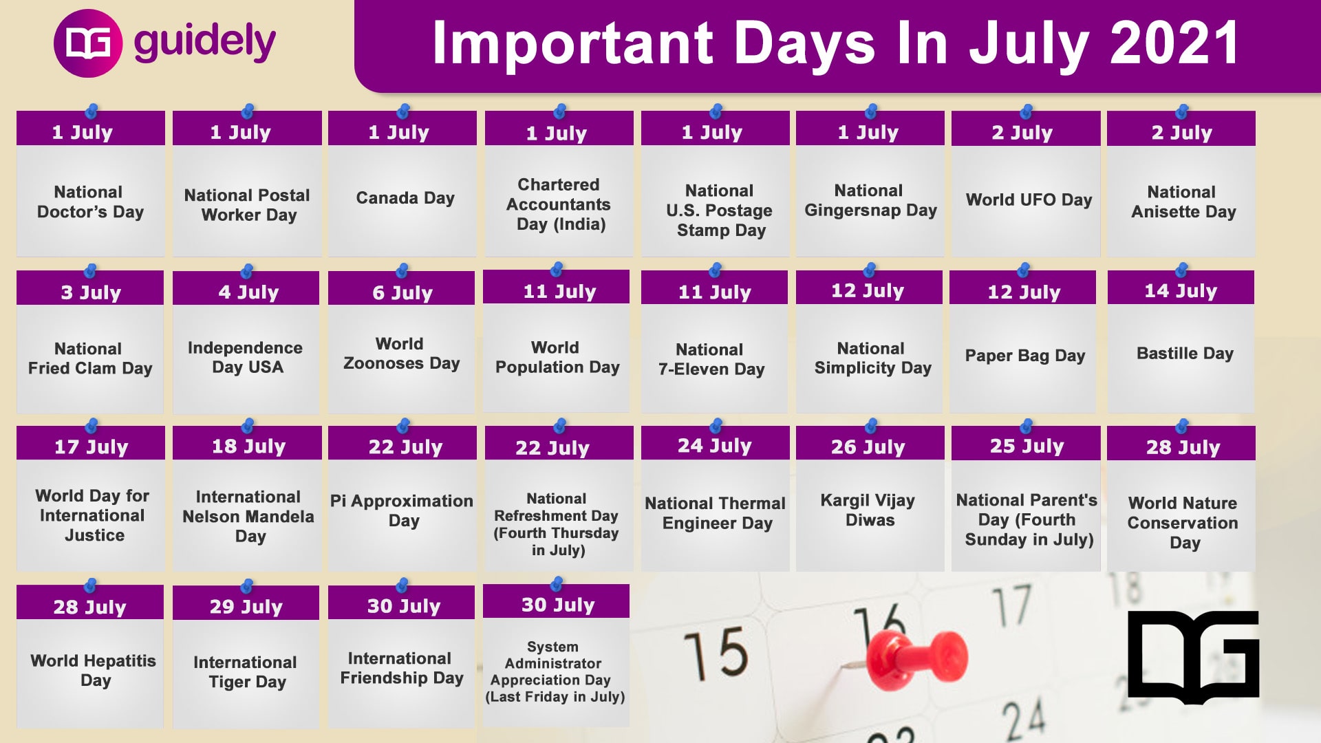 Important Days in July 2021: Candidates preparing for competitive exams can refer to the National and International Important Days in July 2021 with Themes. Study and memorize these Important Days in July 2021 for the current affairs section. Candidates should prepare the List of important days with themes of each month for the competitive exams. Here we provide the list of important days in July 2021 at India & International levels. This article on important days in July month of 2021 deals in detail with all the special days that fall in July. Important Days are celebrated to raise awareness about something very important for us. Check the list of Important Days in July 2021 here.