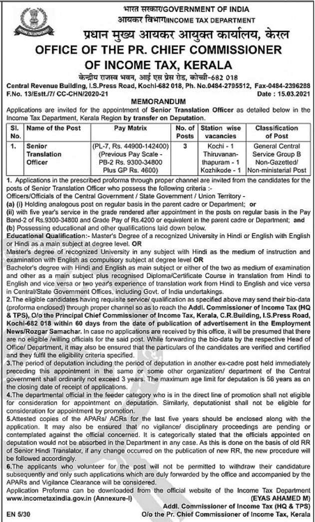 Income Tax Recruitment 2021 Notification is out. The Income Tax department has come up with the notification for the Senior Translation Officer jobs. The income tax recruitment 2021 notification details are available here. The eligible candidates who satisfy the norms for the senior translation officer can apply for this recruitment. Here we compile all the details regarding the Income Tax senior translation officer Recruitment 2021. So that, you can check the important details regarding the selection process, eligibility criteria, qualifications, vacancy, last date to apply, etc. after clarifying all your doubts, you can start your Income Tax Recruitment 2021 apply online process.