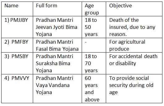 Pradhan Mantri Suraksha Bima Yojana (PMSBY) provides accidental insurance coverage. Information about other insurance schemes is given in the following table: