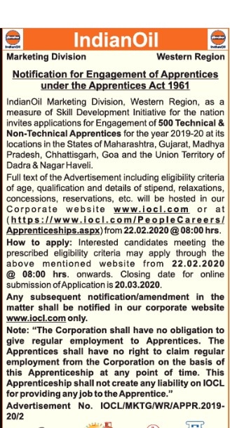The IOCL Recruitment of Apprentices engages at its Locations in the States of Maharashtra, Gujarat, Madhya Pradesh, Chhattisgarh, Goa and the Union Territory of Dadra & Nagar Haveli. The candidates who are passionate about IOCL Apprentice Recruitment 2020 jobs can apply online before the deadline with the required details. The IOCL Vacancy 2020 has prescribed IOCL Eligibility criteria and IOCL Age limit which varies according to the post. So candidates are advised to read the IOCL Notification 2020 instructions carefully and proceed to fill the IOCL Application Form 2020. Moreover, candidates are informed to apply online for anyone of the IOCL posts.