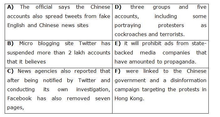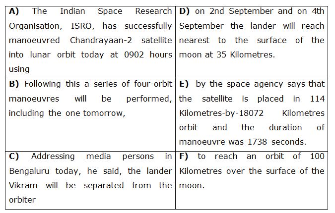 [WpProQuiz 7007]Direction (1-5): In the following questions two columns are given containing three Sentences/phrases each. In first column, sentences/phrases are A, B and C and in the second column the sentences/phrases are D, E and F. A sentence/phrase from the first column may or may not connect with another sentence/phrase from the second column to make a grammatically and contextually correct sentence. Each question has five options, four of which display the sequence(s) in which the sentences/phrases can be joined to form a grammatically and contextually correct sentence. If none of the options given forms a correct sentence after combination, mark (e), i.e. “None of these” as your answer.