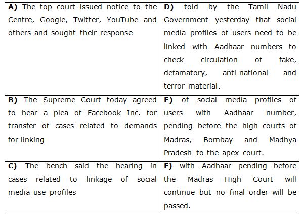 (C-F): The bench said the hearing in cases related to linkage of social media use profiles with Aadhaar pending before the Madras High Court will continue but no final order will be passed.