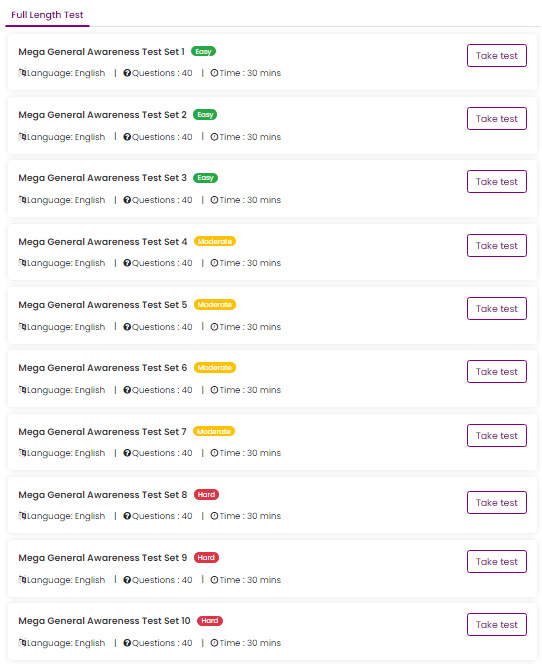 In the banking mains exams, the general awareness section plays a huge role in deciding the winners. Candidates have to work very hard to fetch good marks in the GA section. In the recent banking mains exams, many questions were tough and asked from in-depth contents. So, many candidates found it difficult to score marks in the general awareness section. To overcome this issue, practice with the Mega General awareness Score Booster online test series. In this series, you can practice a total of 40 test sets. A total of 2400 questions are available from the in-depth content of the last 8 months of current affairs news. Also, the questions will be accurately in the mains exam point of view. So practice and boost your score in the GA section.