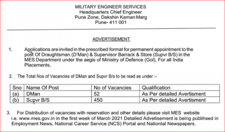 MES Recruitment 2021: Military Engineering Services (MES) has announced a short notification of MES Recruitment for Draughtsman & Supervisor posts. A total of MES Recruitment 2021 is 502 vacancies. MES Recruitment 2021 is especially for the candidates having the educational qualification in Diploma & Degree. The online application starting and ending date have not been given in detail. The detailedMES Recruitment 2021 notification will get released on its official site within a short due course. Passionate candidates who are seeking to get into the defence sector shall utilize this upcoming MES Recruitment 2021. Further details regarding the MES Recruitment 2021 are given here below for your reference.