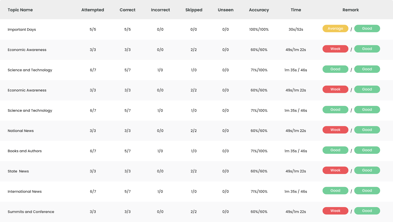 • The analysis will be topic-wise such as appointments, awards, sports news, etc. So, that you can easily identify that you are weak in which topic.