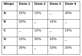 7) Quantity I: Item 3, cost price of all the shops is Rs. 4800 and the marked price is 40%, 50% and 25% more than the cost price in shop B, D and E respectively. Find the total selling price of shop B, D and E together