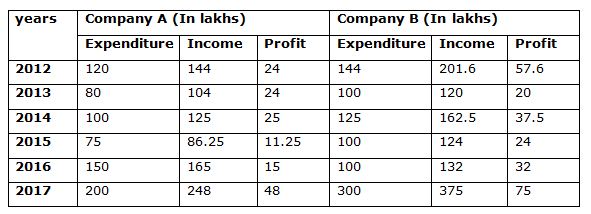 7) Quantity I: Find the difference of total income of company A in the year 2015, 2016 and 2017 together to that of total expenditure of company B in the year 2012, 2013 and 2014 together?