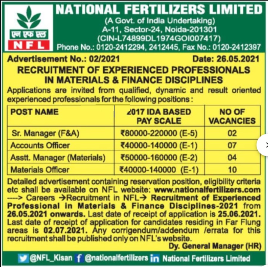 The NFL Recruitment Notification 2021 has been released on the official website on 26th May 2021. Eligible candidates can apply online for Senior Manager, Accounts Officer, Assistant Manager, and Materials Officer Posts at the official website. Interested candidates can check the NFL Recruitment Notification 2021 from the link given below.