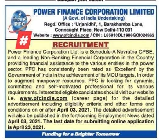 PFC Recruitment 2021: Power Finance Corporation Limited, one of the Navratna Public Sector Undertaking companies has released its short notice in the employment notice regarding the recruitment of various vacancies. The detailed notification will get released on its official site on or after 03rd April 2021. The PFC Recruitment 2021 Apply Online link is get activated on or after April 03, 2021. The PDF careers are looking for young and energetic candidates. Candidates who are having a passion to work in the Public Sector Undertaking comes under the navratna status shall utilize this golden opportunity. The final date to submit the online application will be on 23rd April 2021. Selected candidates will get a high package of salary along with consistent career growth. Further details regarding the PFC Recruitment 2021 are given below for your reference.