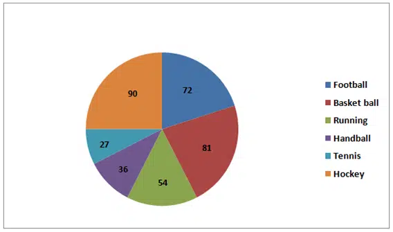 The given pie-chart shows the degree distribution of the number of students who participated in six different games namely Football, Basket ball, Running, Handball, Tennis and Hockey.