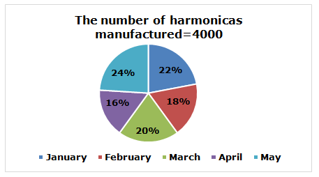 The given pie chart shows the percentage distribution of the number of harmonicas manufactured in five different months i.e. January, February, March, April and May.