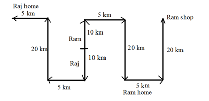 If Ram and Raj are two friends . They start walking from same point but in opposite direction . Ram walks towards north . After Walking 10 km ram takes a right turn and walks for 5km then turns 90 degree clockwise direction and walks 20 km to reach his home and takes a left turn and walks 5 km . Raj also follows the same condition as Ram .