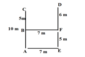 Point C is 10m North of point A. Point B is exactly in the middle of the point C and A. Point E is 7m east of point A. Point F is 7m east of the point Band 6m south of D.