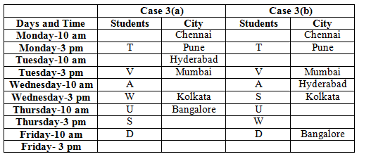 Ten students-A, B, C, D, E, S, T, U, V and W have a seminar in five different days in same week starting from Monday and ending on Friday. Each student has seminar at two different time slots10 am and 3 pm of the given days. Each of them likes different cities, Chennai, Pune, Bangalore, Hyderabad, Mumbai, Delhi, Patna, Shillong, Kolkata and Agra, but not necessarily in the same order.
