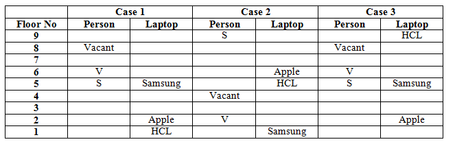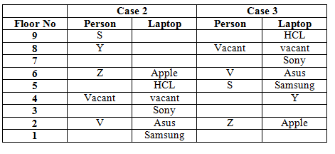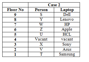 Eight persons-S, T, U, V, W, X, Y and Z are living in a nine floor building. The lowermost floor is numbered one, above it numbered two and so on until the topmost floor is numbered nine. One of the floors is vacant. Each of them likes different laptop brands, Dell, Sony, Apple, HP, HCL, Samsung, Asus and Lenovo, but not necessarily in the same order.
